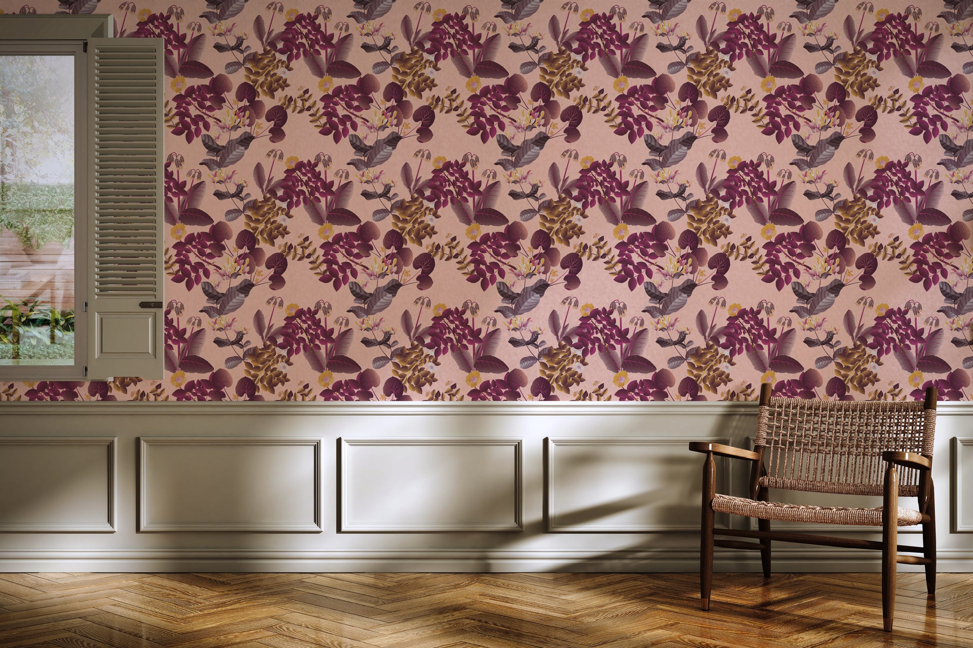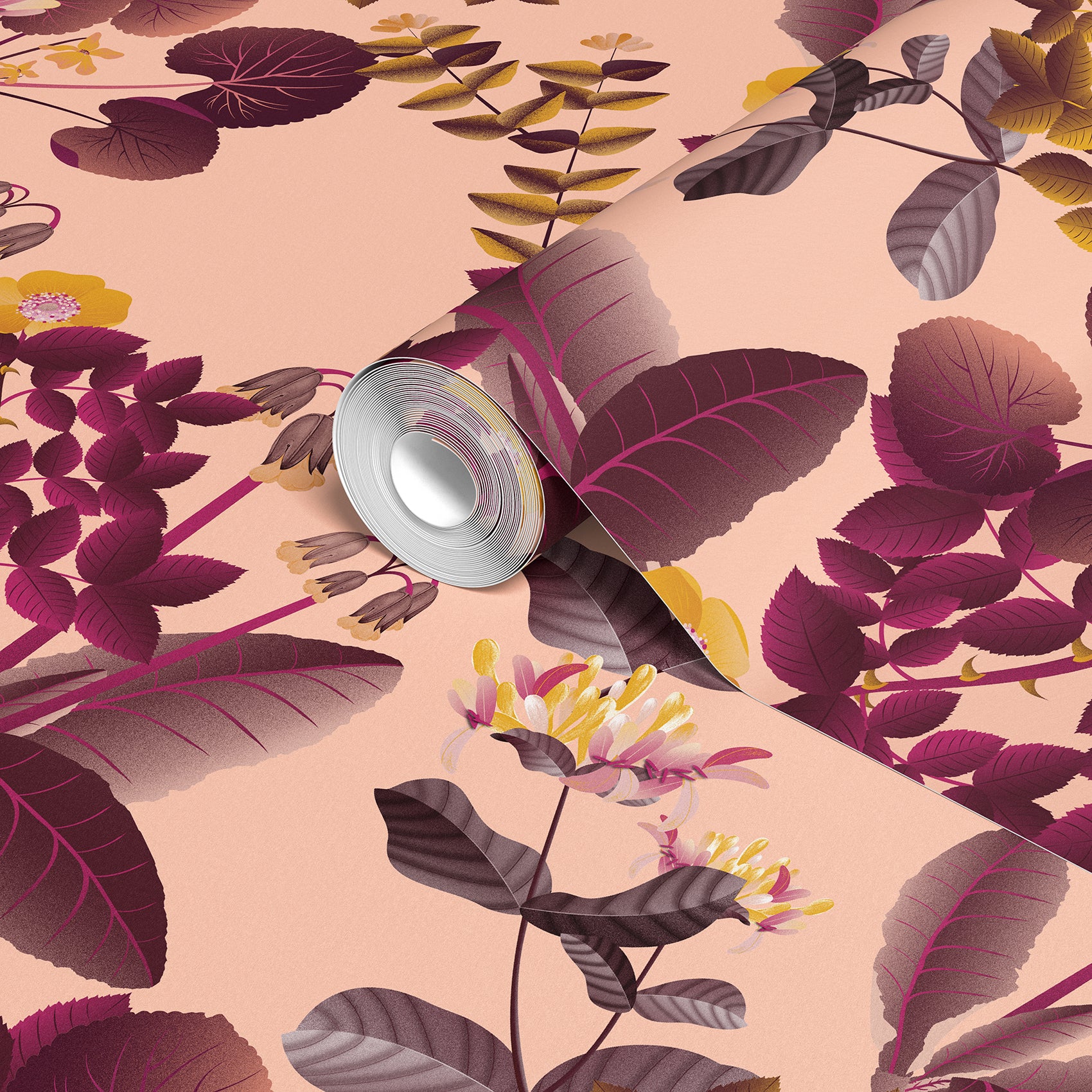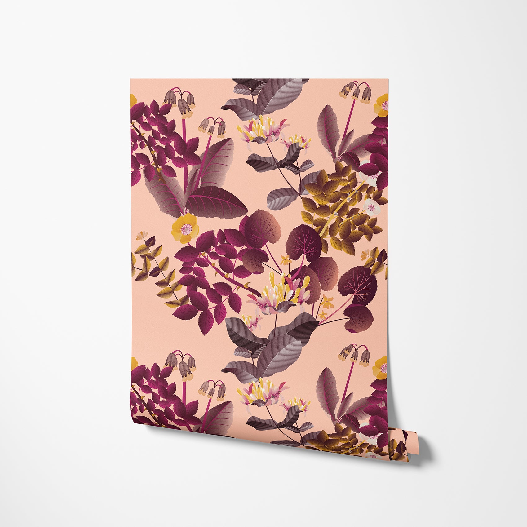 Floral wallpaper with warm aubergine, rose, and orange tones. Bright and uplifting for energised interiors. Inspired by fairies and firelight.