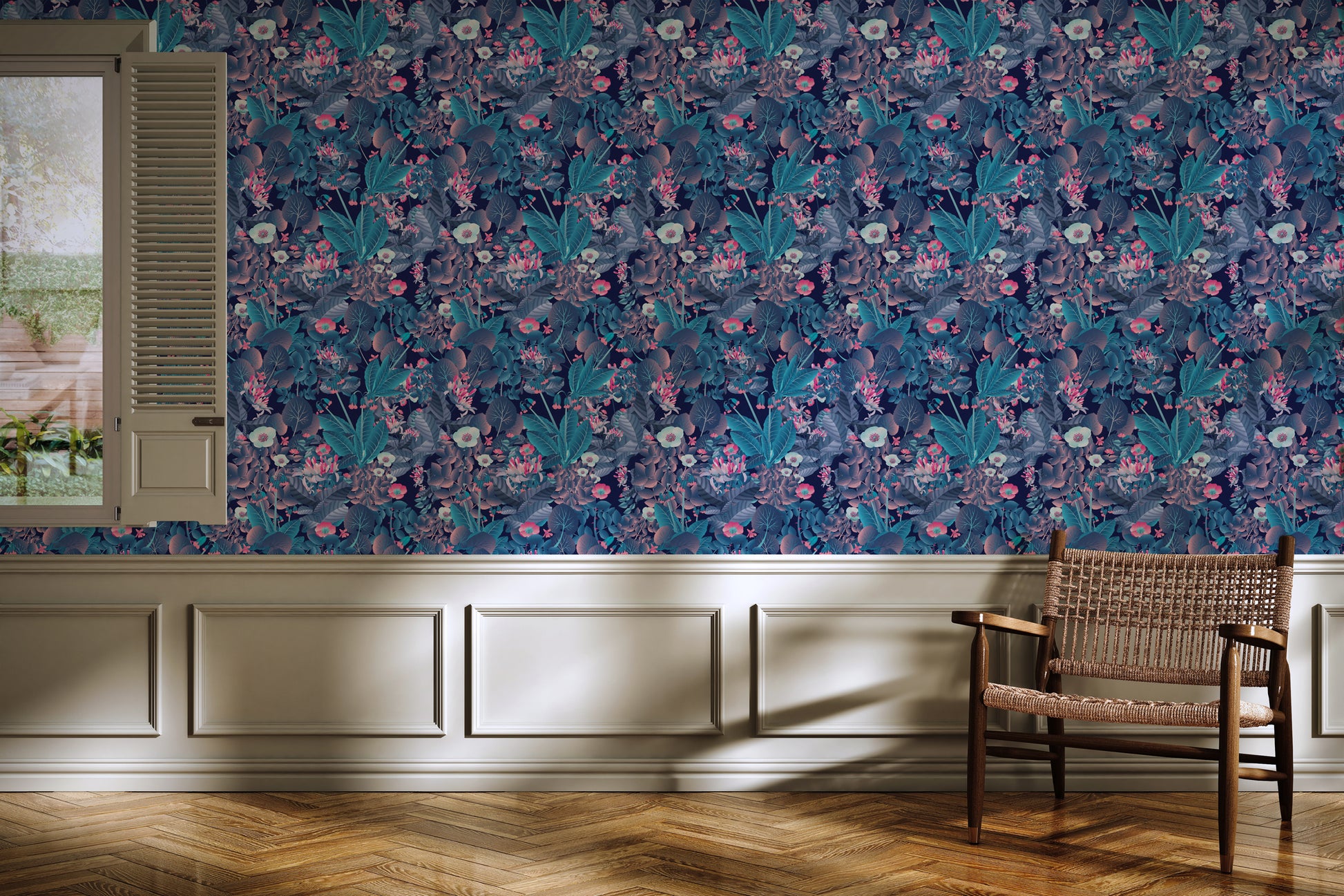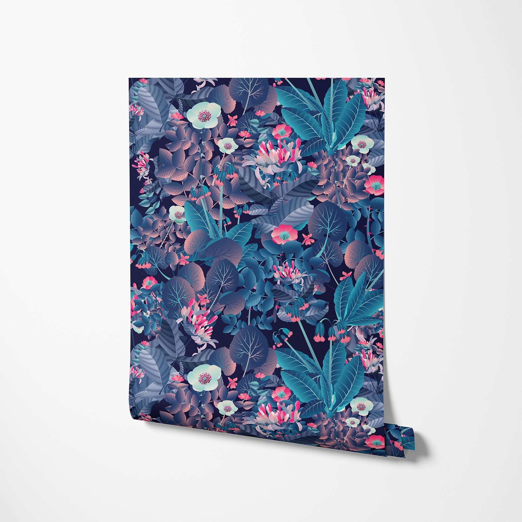 Bold floral wallpaper with ruby, turquoise, and deep blue hues. A vibrant night version to add mood and depth to your room.